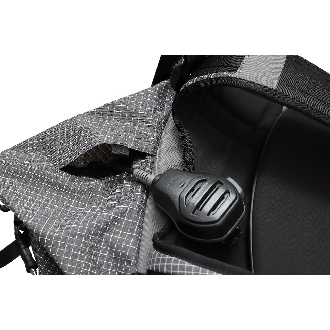 スピーカーマイクを使用する場合は、この部分に無線機を取り付けて上部ポケットにある斜めに開くベルクロ開閉式のトンネルから、無線機に接続されたままのスピーカーマイクを通すことができます。(周囲18cmまでの大きさのスピーカーマイクや無線機が通ります)